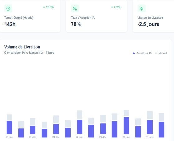 Mesure du temps gagné, de l'adoption et du volume de livrables produits.